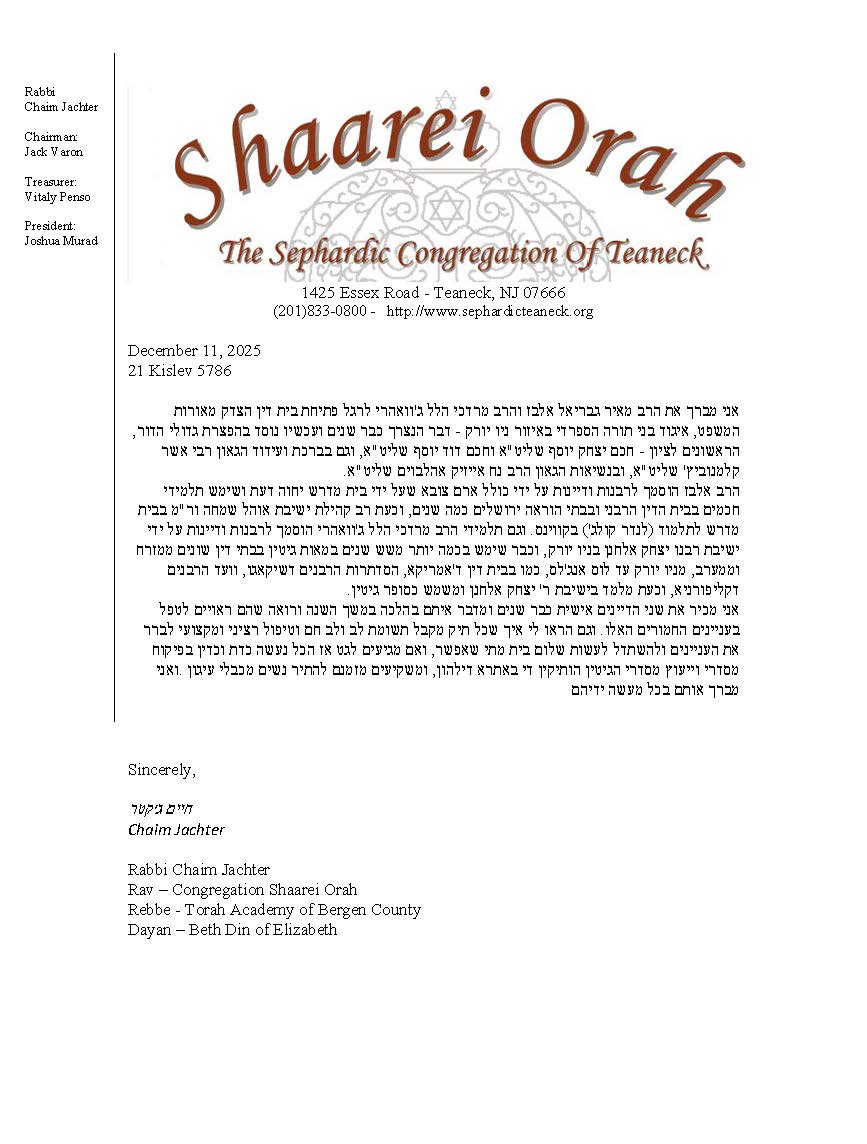 The Bet Din is professional, competent, and transparent. Every case is handled with care and compassion to make the process as comfortable and straightforward as possible for the parties. Every Get is prepared for with some of the greatest Dayanim in the country to ensure the highest level of Halachic service.